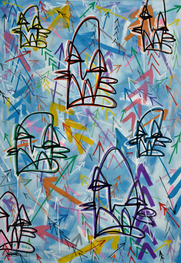 • “It is all about progression and moving forward. Like many others, I strive to be a better person than I was yesterday. Progressing on our goals, passions, desires, and getting closer to where and who we want to be is the narrative here. Is there an end goal or moment? Do we just keep on going until we can’t anymore? I don’t know. We will face obstacles pursuing our desires; I represent this in the painting with directional symbols overlapping, moving in tandem, and conflicting with one another, but in the end…THE ONLY WAY IS UP.”